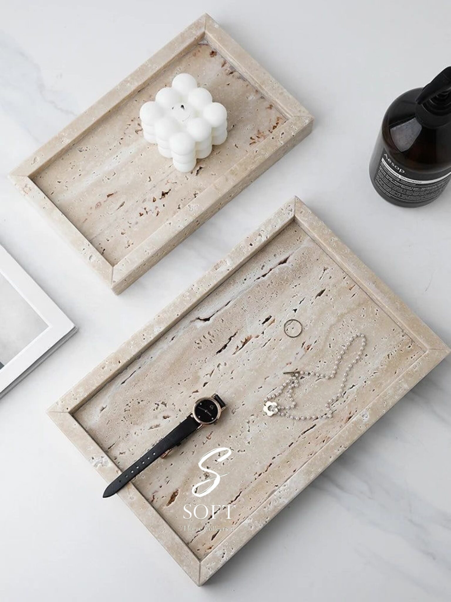 سینی مستطیل تراورتن، انتخابی شیک و طبیعی برای نظمدهی میز و چیدمان اکسسوری اتاق خواب؛ مقاوم، مینیمال و مناسب دکور لوکس.